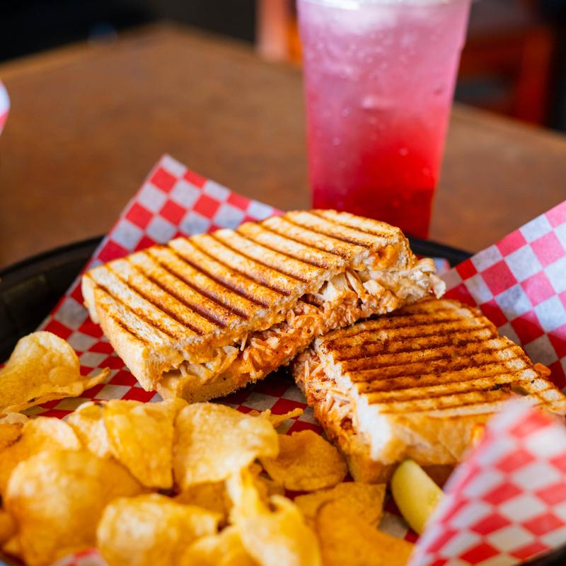 Pressed & grilled to a tasteful perfection. Served with a pickle spear & chips • Chip choice: Plain Ruffles | BBQ Lays | Garden Sunchip | Cheddar Sunchip | Salt & Vinegar | Jalapeño